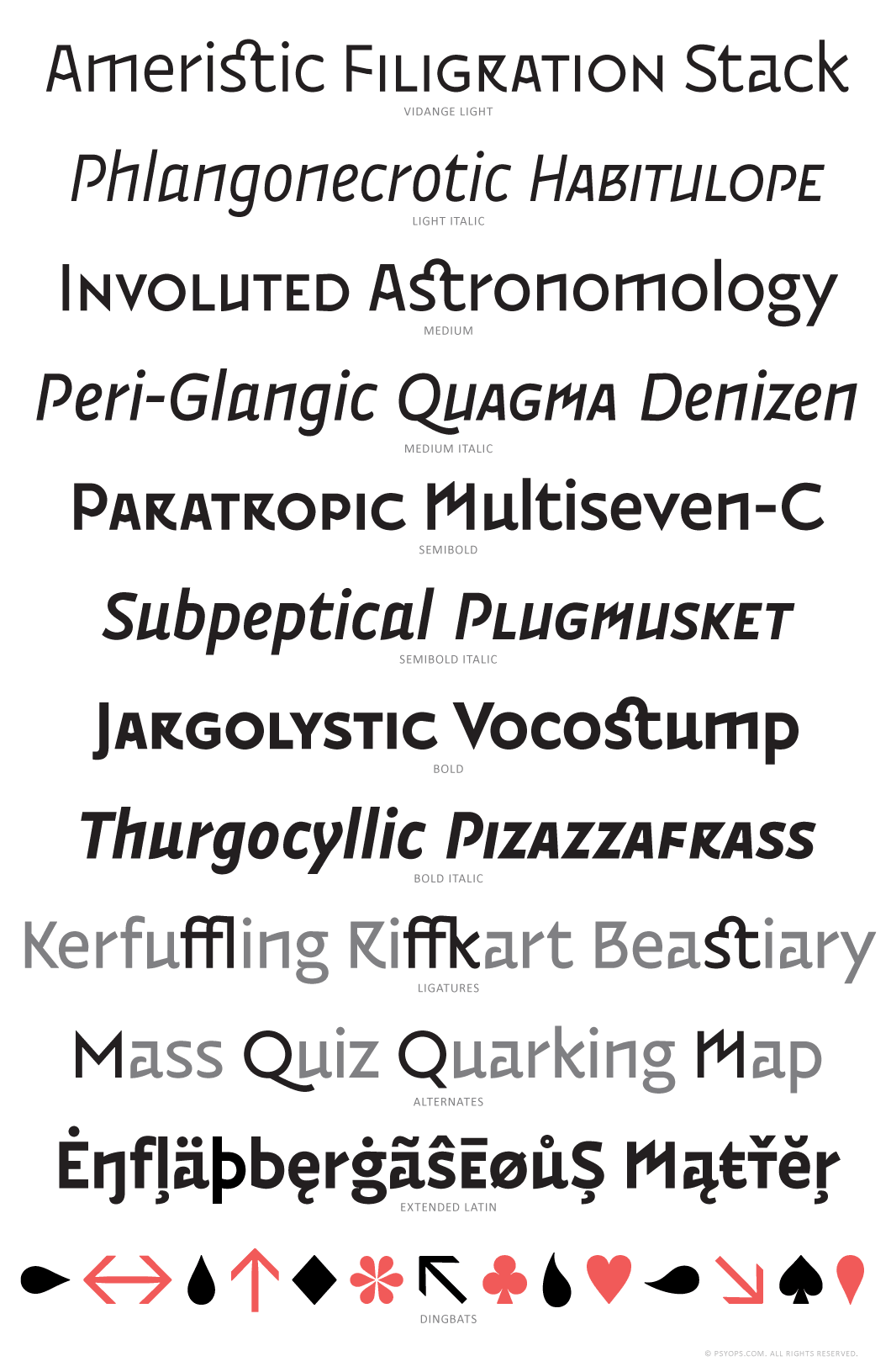 The Vidange Pro fonts include: Western and Eastern European characters, smallcaps, ligatures, stylistic alternates, and four different sets of figures, and more.